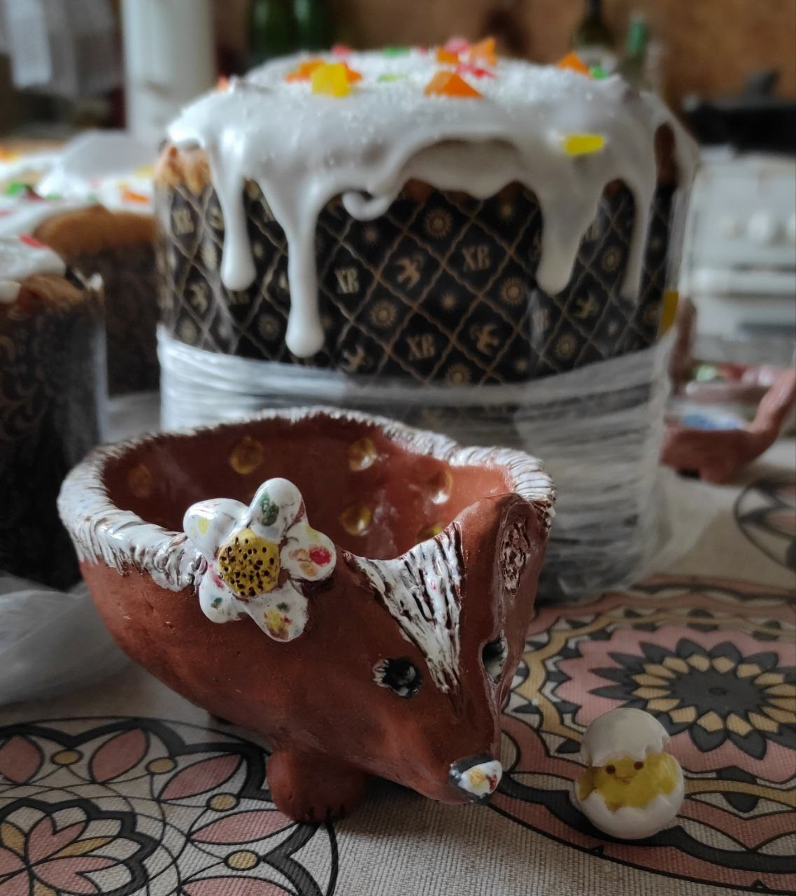 Сразу красим ангобами, по желанию можем добавить эффектарной глазури ко второму обжигу.